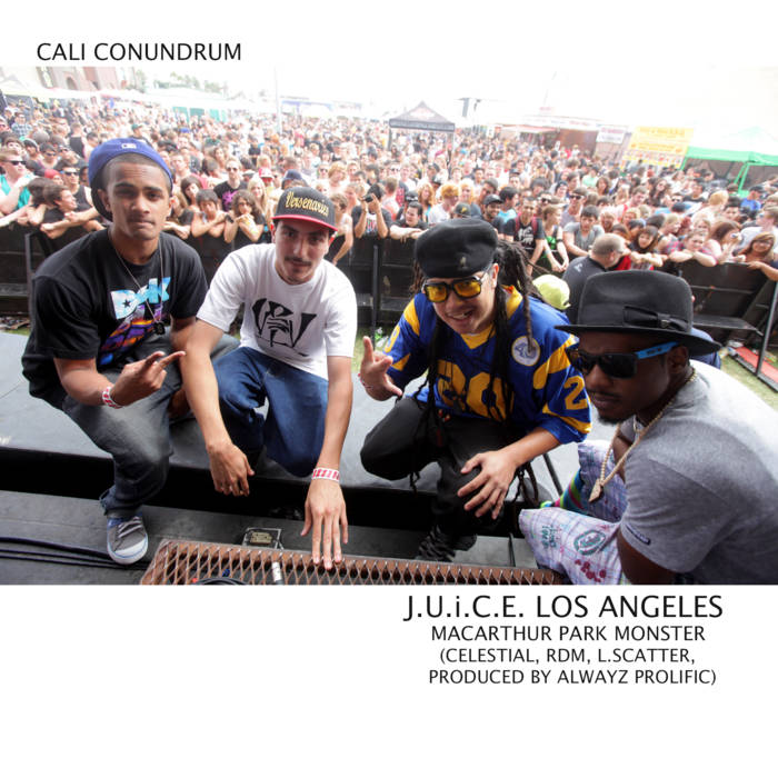 J.U.i.C.E. Los Angeles MacArthur Park Monster or Celestial and RDM together with L. Scatter in the Prolific produced track "Cali Conundrum".